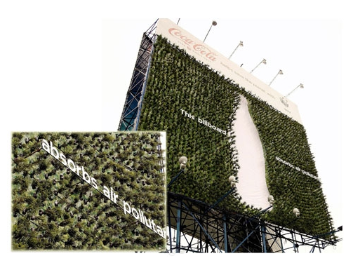 "The 60 x 60 ft. plant billboard, located along Northbound EDSA-Forbes, utilizes a thriving species of Fukien tea plant, which absorbs air pollutants. According to botanist Anthony Gao, each plant can absorb up to 13 pounds of carbon dioxide in a year, on the average. 'This billboard helps alleviate air pollution within its proximate areas as it can absorb a total of 46,800 pounds of carbon dioxide from the atmosphere, on estimate.' Gao says.